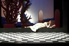 Crissements de calèche sur la rocaille, horizon lointain avec écran, jeux d’ombres et de lumières, intensité d’un coucher de soleil ou magnétisme lunaire sur quelques tombes endormies, un arbre solitaire culmine dans le récit dramatique de Kleist, La Marquise d’O…, réinventé pour la scène par Lukas Hemleb. C’est une narration étrange tissée de circonvolutions entêtées à ne jamais vouloir nommer leur objet et dont l’écho gagne en profondeur du côté de la sensibilité, de l’exaltation et de la rêverie. L’écriture mélancolique de Kleist relève d’un tempo à l’allure vive, à la fois emportée et contrôlée, à la manière d’une chevauchée fantastique de rêve éveillé. À l’intérieur du château, un sol carrelé blanc et noir de jeu d’échecs accueille l’aventure inouïe qui est échue à la Marquise. Fin du dix-huitième italien, la Marquise d’O…, fille d’un gouverneur de citadelle que les Russes assiègent, est sur le point d’être victime des derniers outrages infligés par de grossiers soldats. Par un heureux hasard, la voilà sauvée de ces brigands par la vélocité d’un Comte déterminé à la protéger plus ardemment encore qu’il ne le faudrait.